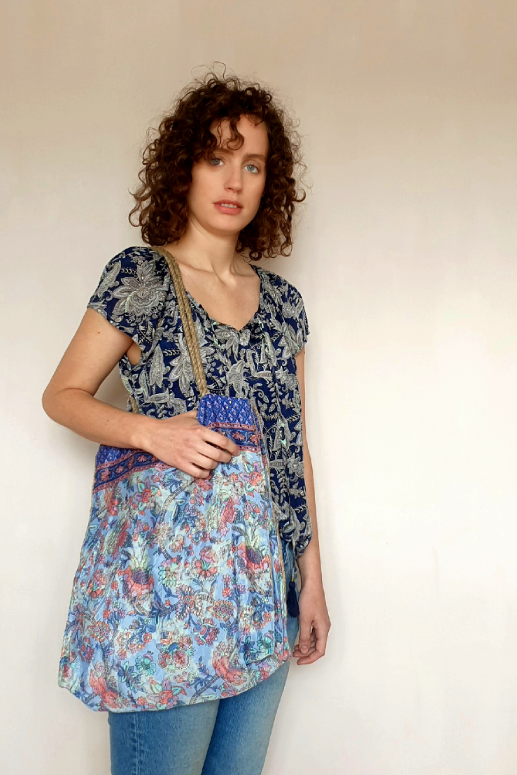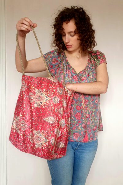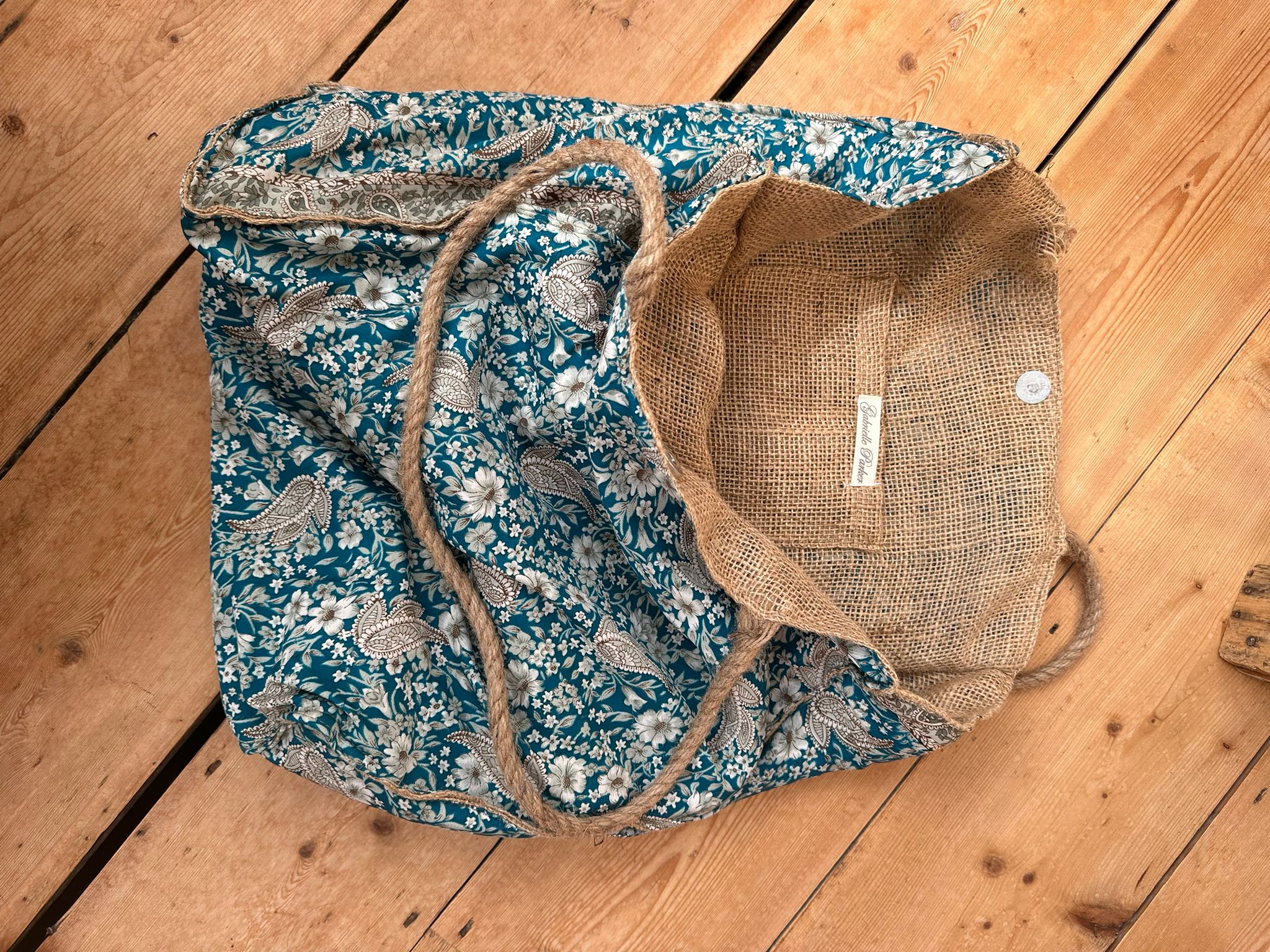 Hessian lined shoulder bag with rope straps and a central popper fastening. It has one inside pocket. Height 45cm, 35cm wide, 13cm wide. Strap length 71cm. Hand wash only. Please not model images are for size reference only.